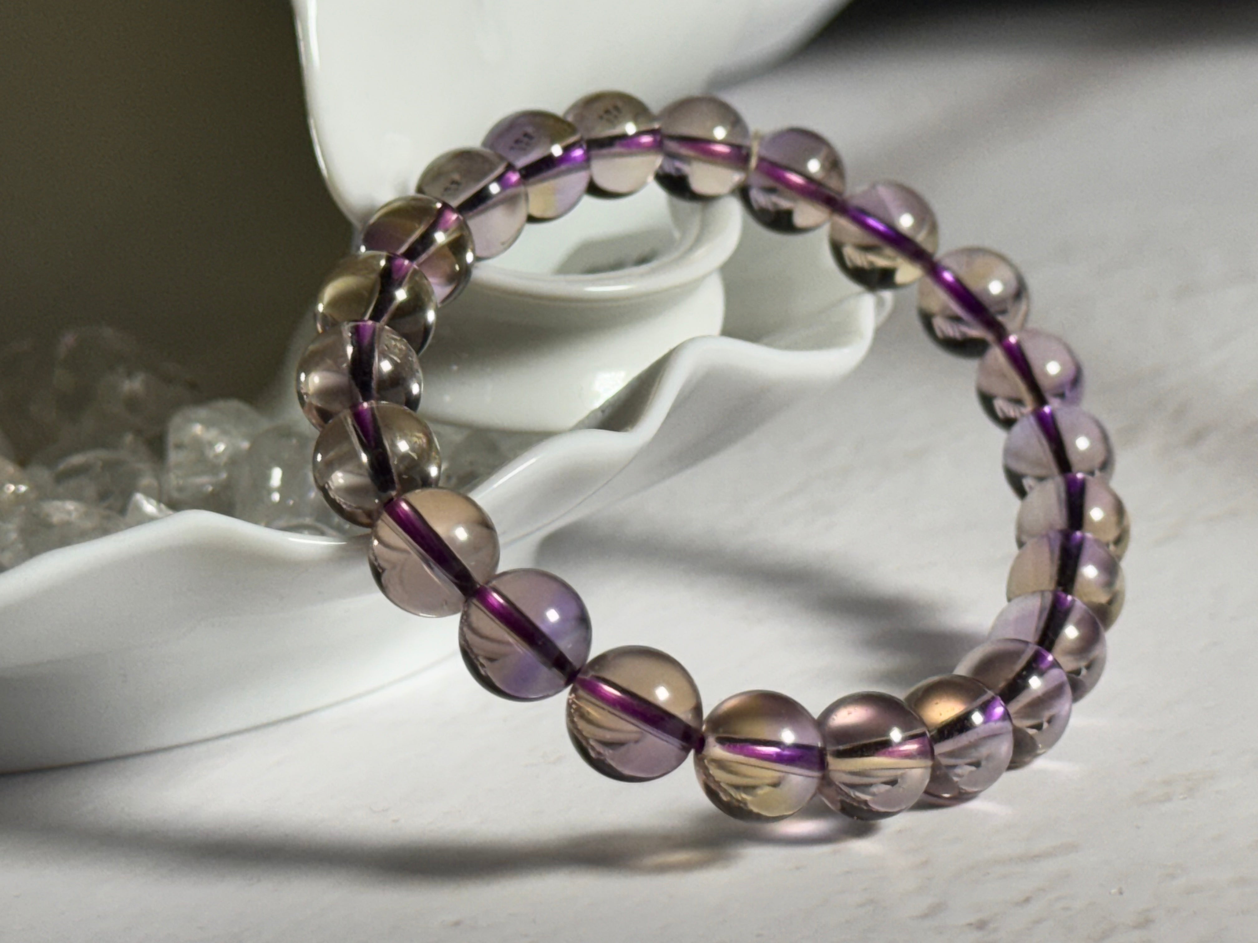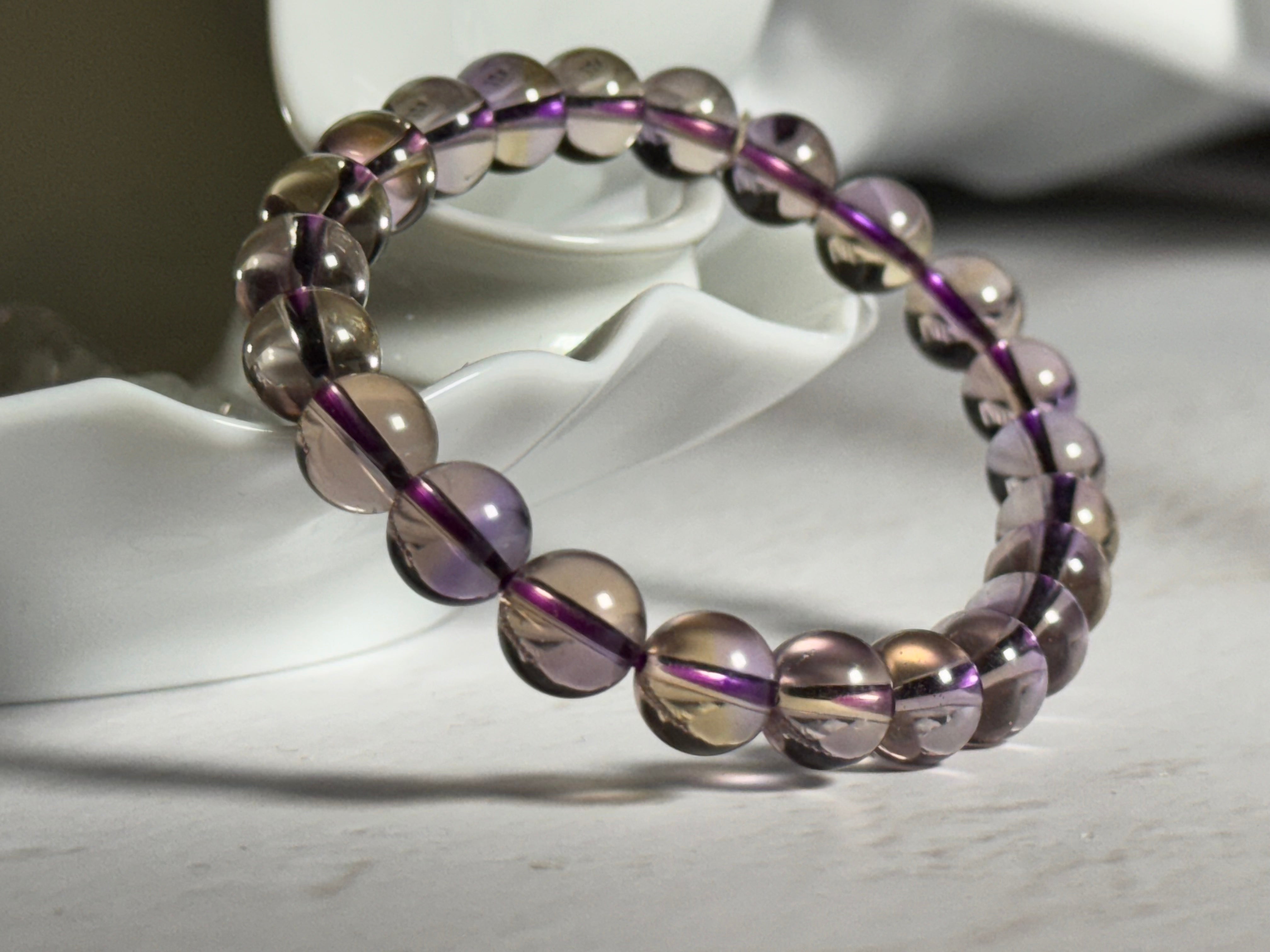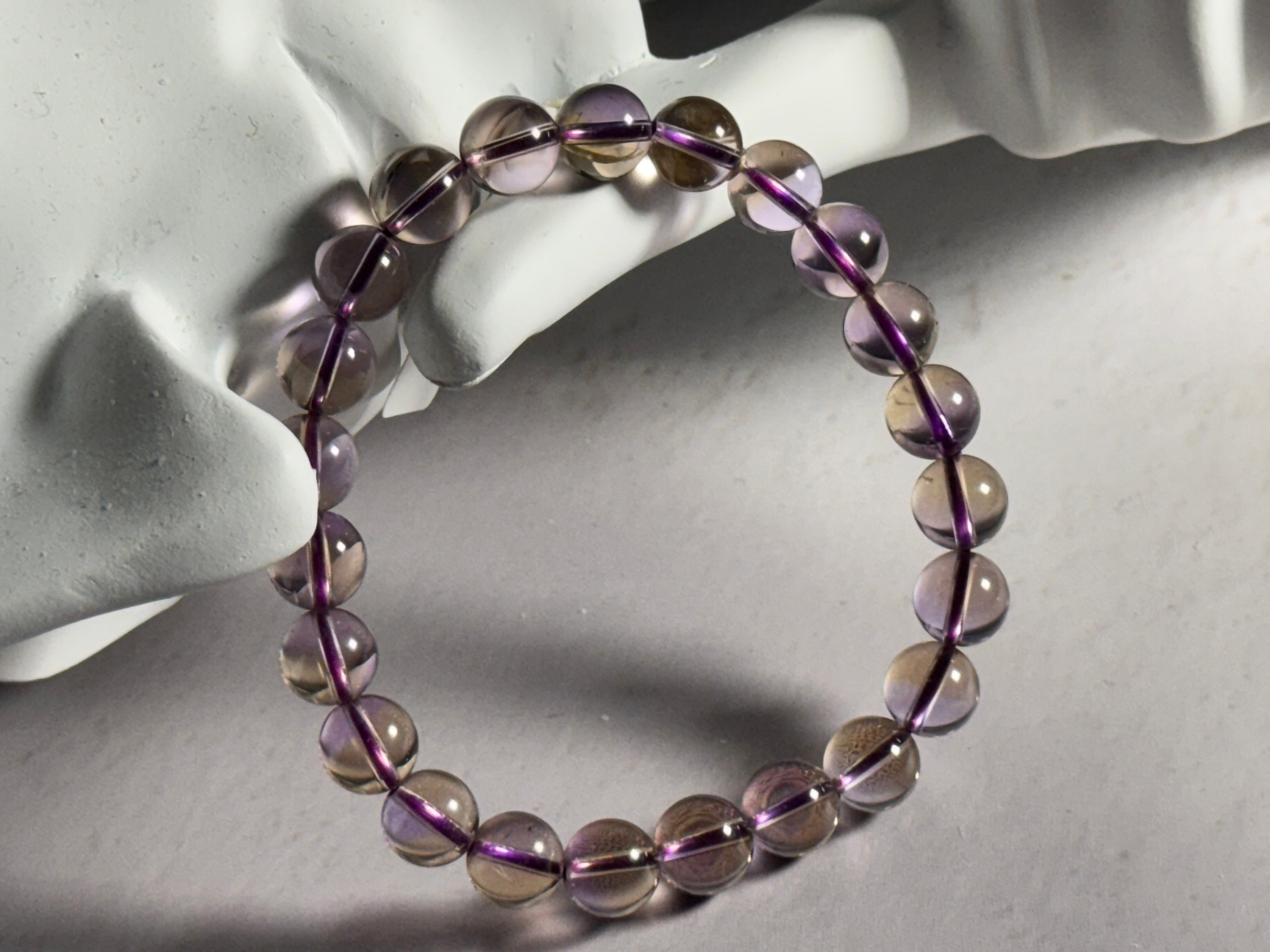 Ametrine is a unique natural crystal that combines the energies of amethyst and citrine, symbolizing wisdom and wealth. It embodies the calming and balancing effects of amethyst, along with the confidence-boosting and prosperity-attracting qualities of citrine. Wearing ametrine can help enhance intuition and insight, enabling the wearer to make decisions calmly and rationally. Additionally, ametrine helps build personal confidence, attract good fortune and wealth, and bring positive energy. It also aids in relieving stress and balancing emotions, making it an ideal crystal for achieving inner peace and external success.