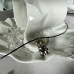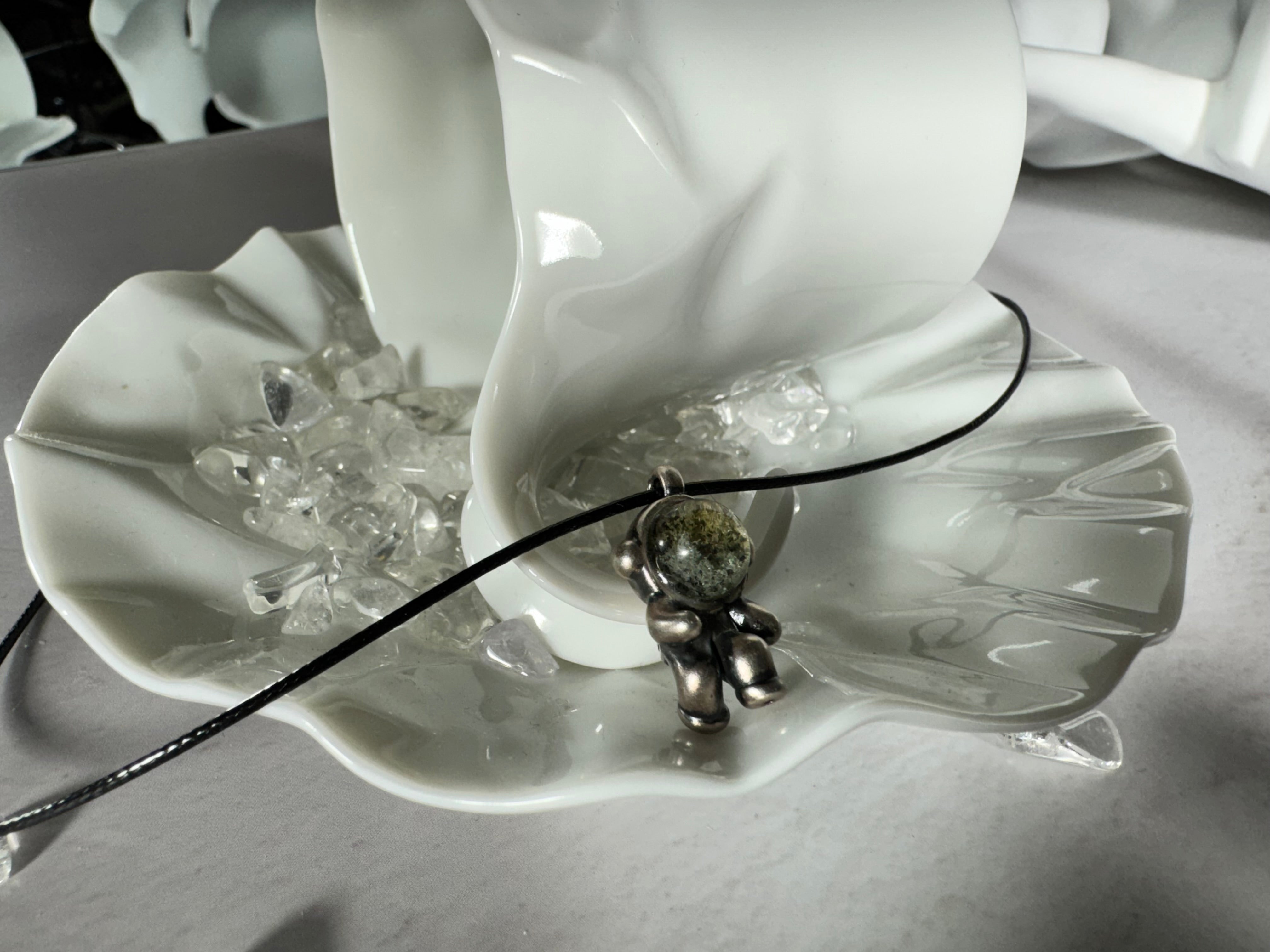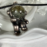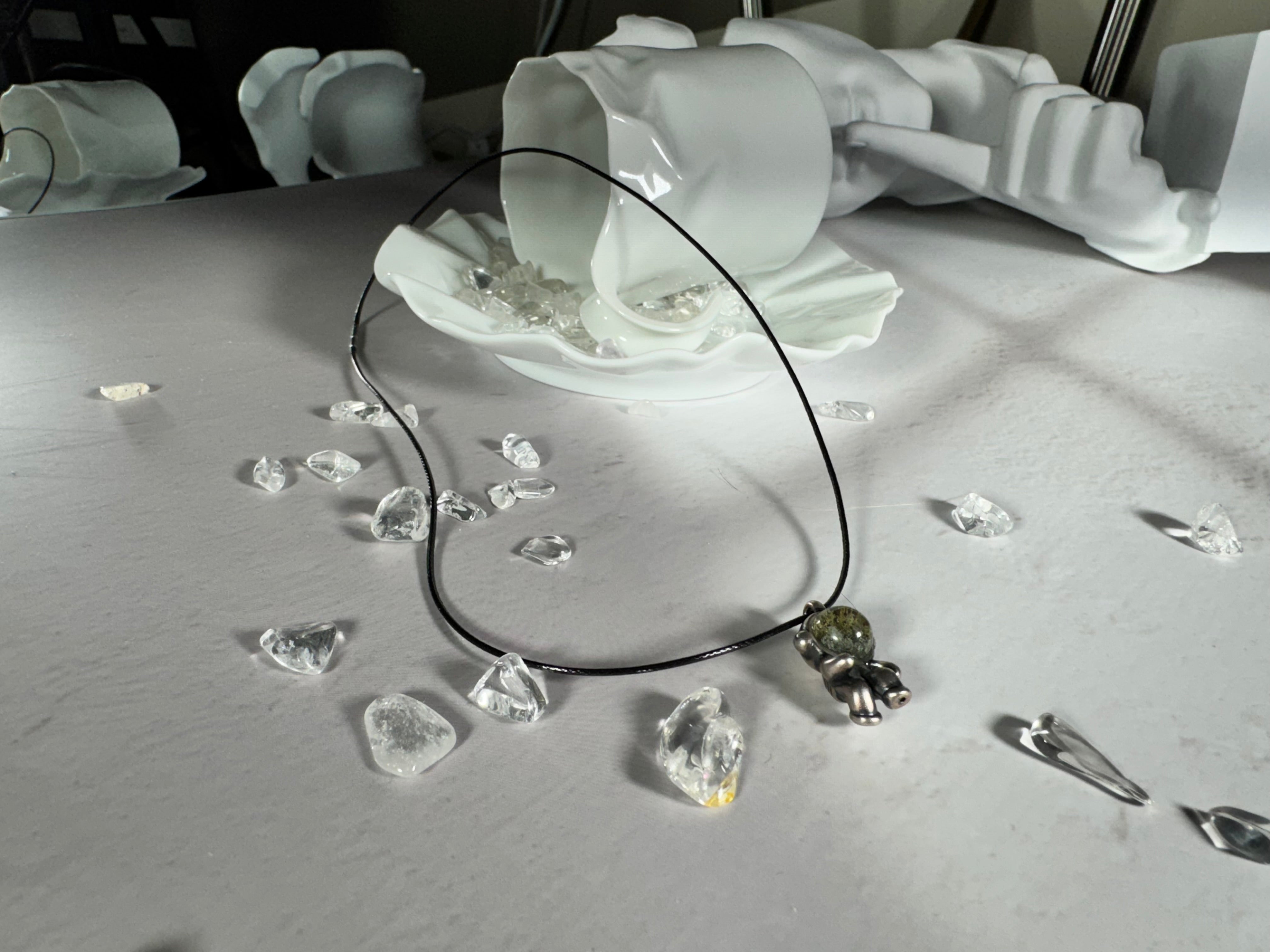This unique pendant necklace features a small metal humanoid charm holding a natural crystal bead with a soft green hue and delicate texture, giving the pendant an earthy and natural vibe. The charm’s design is cute and artistic, paired with a black cord, creating a minimalist yet elegant style that is perfect for everyday wear or as a statement accessory. Surrounding the necklace are multiple clear crystal fragments, adding a touch of sophistication and creating a pure, dreamy ambiance.