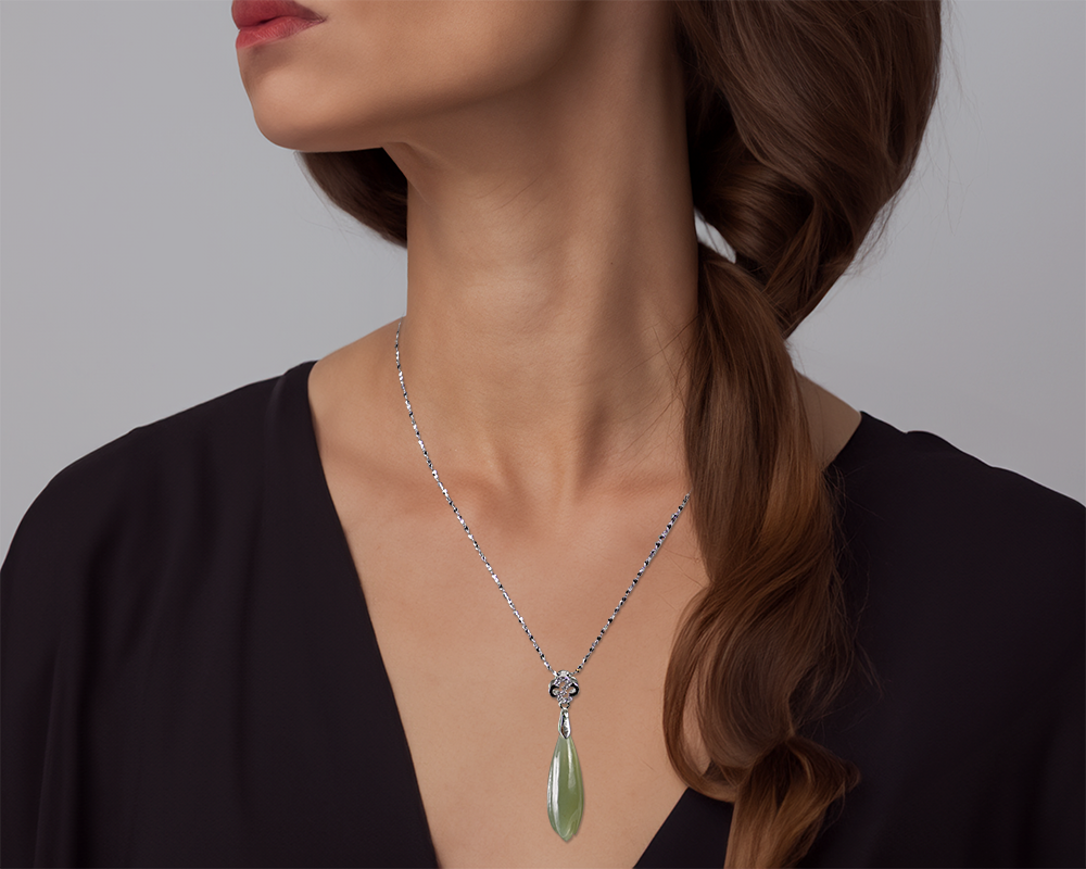 Introducing our Seaform Jade Necklace Pendant, a captivating piece inspired by the tranquil depths of the ocean. The Seaform Jade Necklace Pendant boasts a unique design that mirrors the mesmerizing hues of seafoam. Crafted with precision, the pendant encapsulates the essence of serene beauty.
