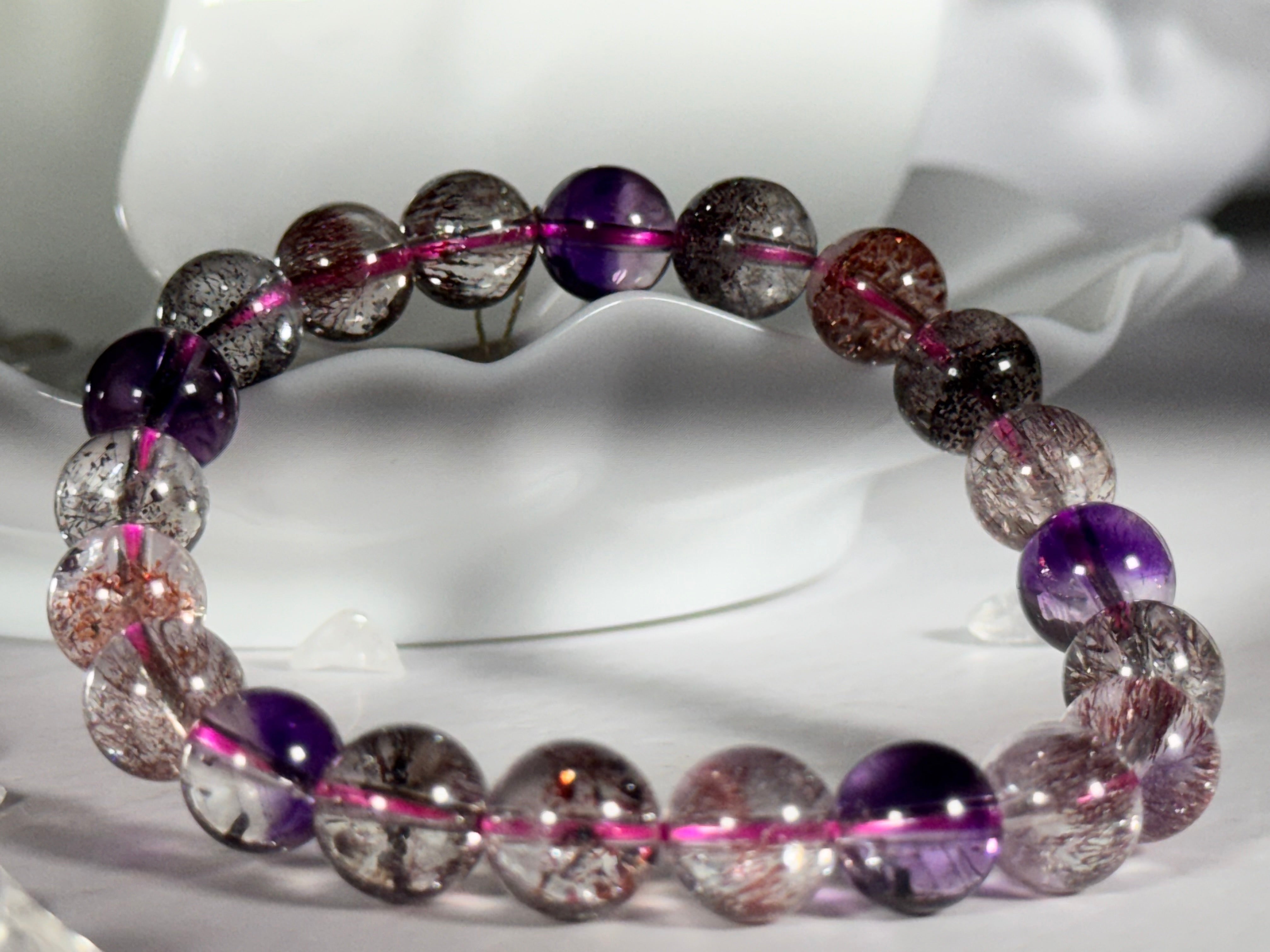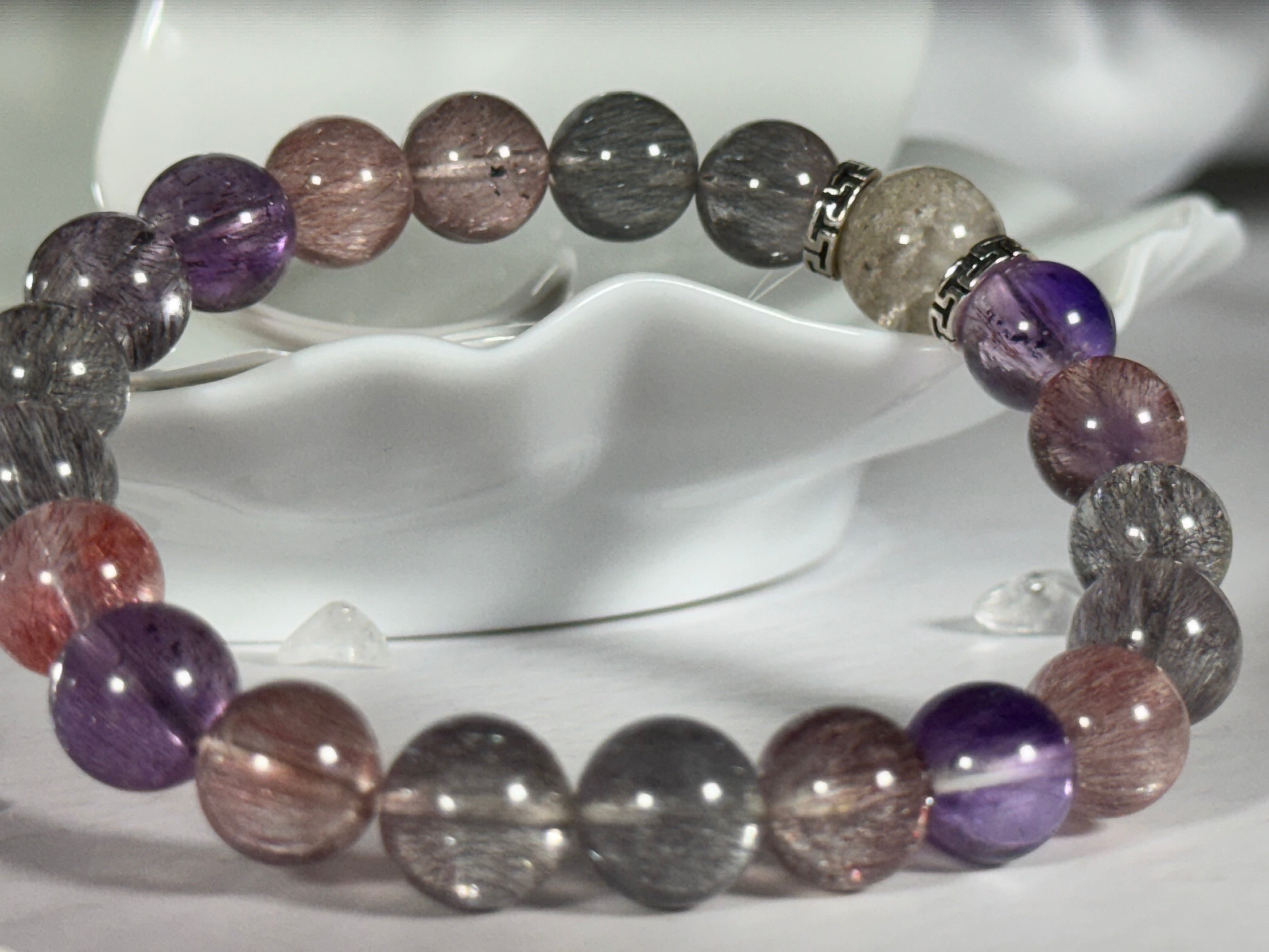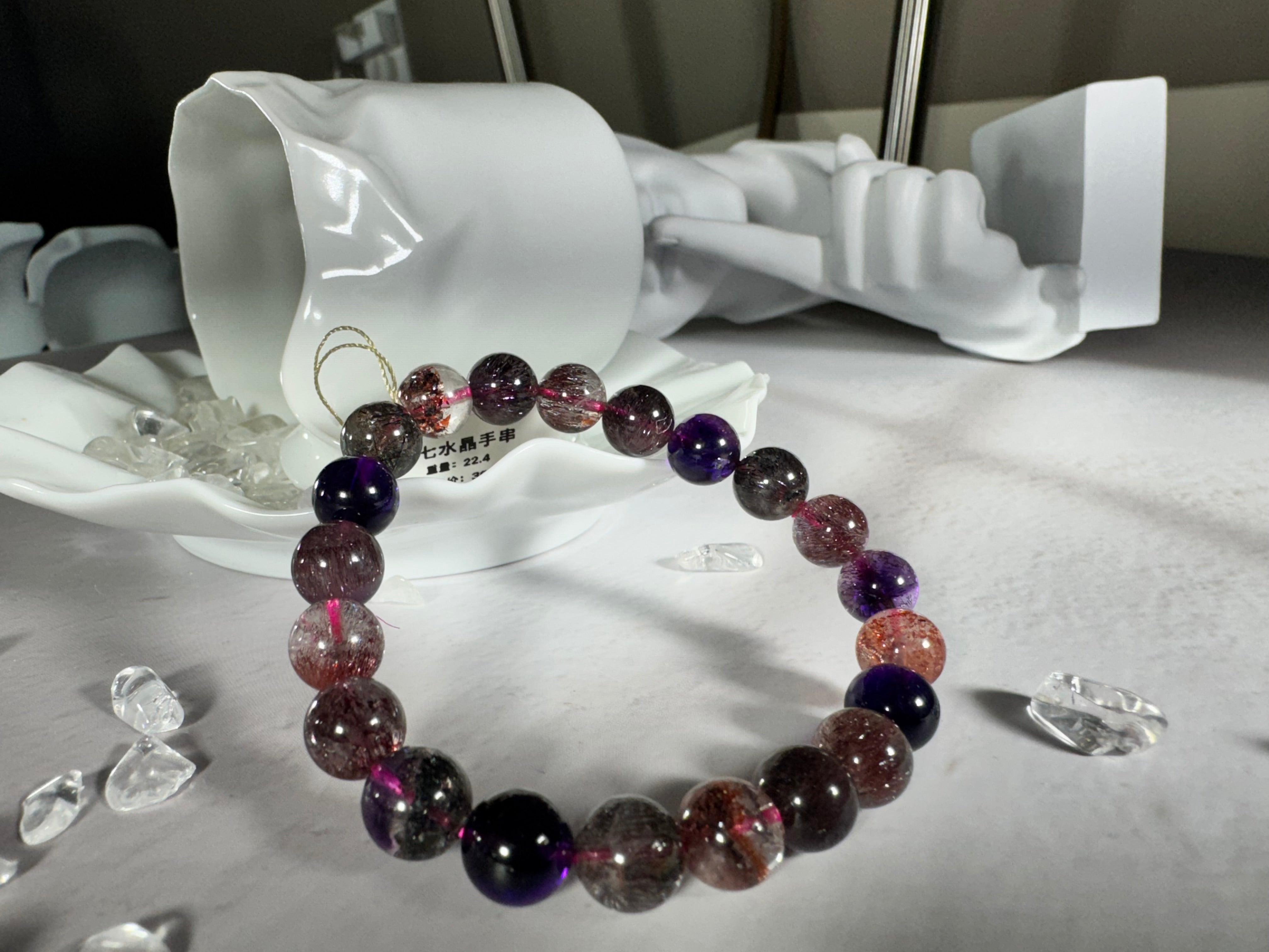 超七水晶手链,由七种不同矿物共同组成,因其丰富的内含物和多样的能量而闻名,具有许多独特的好处。首先,超七水晶被视为能量增强石,能放大正能量并帮助佩戴者提升自我意识与灵性成长,非常适合追求内在提升的人士。其次,超七水晶具备净化和保护的功能,能够清除负面能量,使佩戴者在面对压力和负面情绪时保持内心的平衡。它还具有强化直觉和洞察力的作用,帮助佩戴者在复杂的环境中更清晰地看待问题。此外,超七水晶手链被认为能够平衡人体的七个脉轮,促进整体的身心健康。总体而言,超七水晶手链是追求自我成长、能量平衡和灵性觉醒的理想选择。