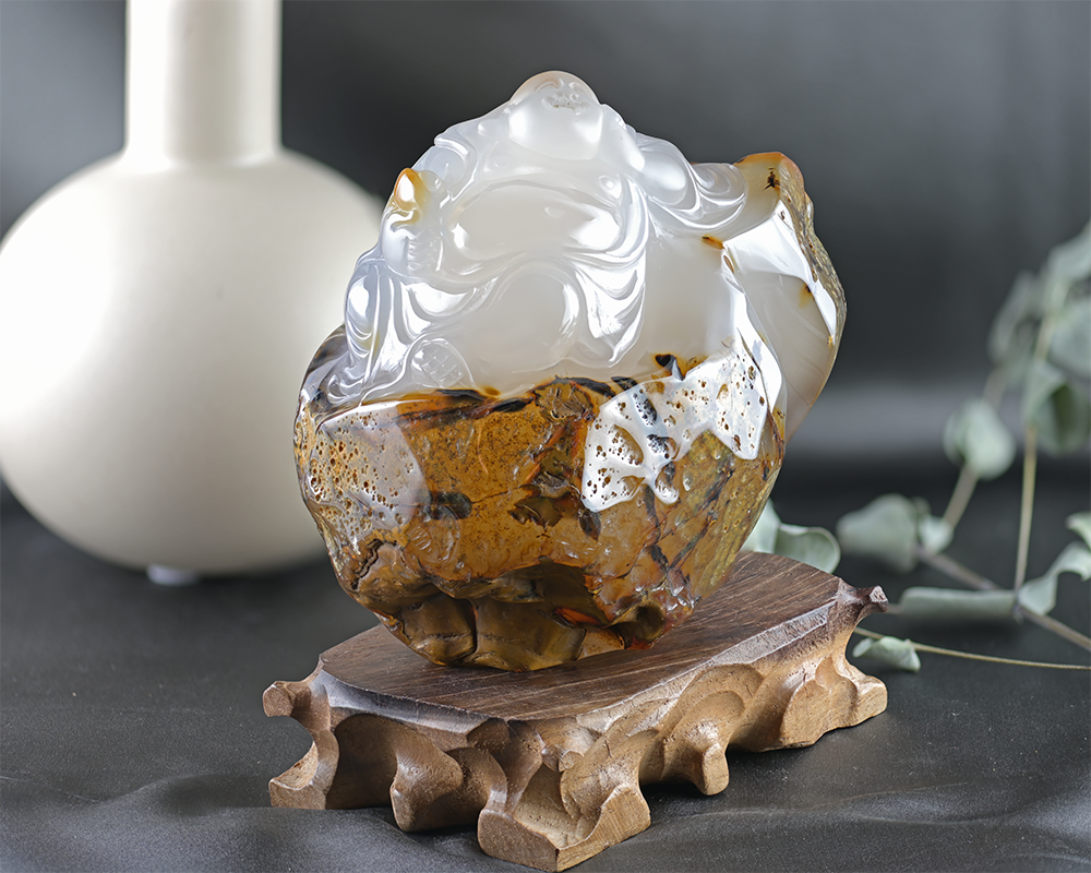 The blessing Buddha, nestled within the intricate design, represents enlightenment, compassion, and inner peace. The Zen Master Laughing Buddha Opaline Pearl Agate Sculpture becomes a powerful talisman for cultivating positive energy and well-being.